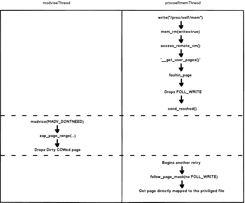 It’s all because the kernel is lying here. In its subsequent retry after being told a dirty COW page is ready, it goes on to tell follow_page_mask and handle_mm_fault that only read-only access is needed. The two functions happily comply and return a page that’s best optimised for the job. In this case, it returns a page that if we perform modification on it would get written back to original privileged file.